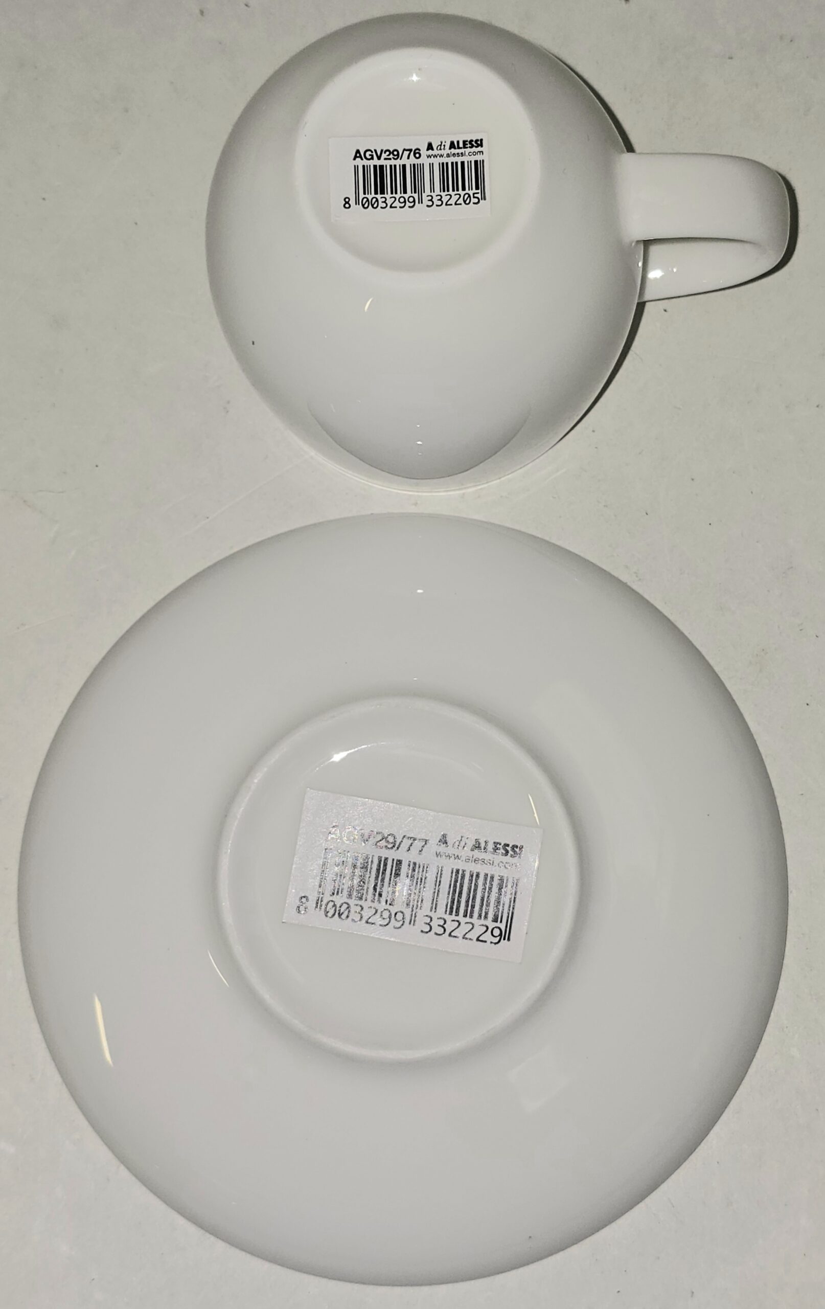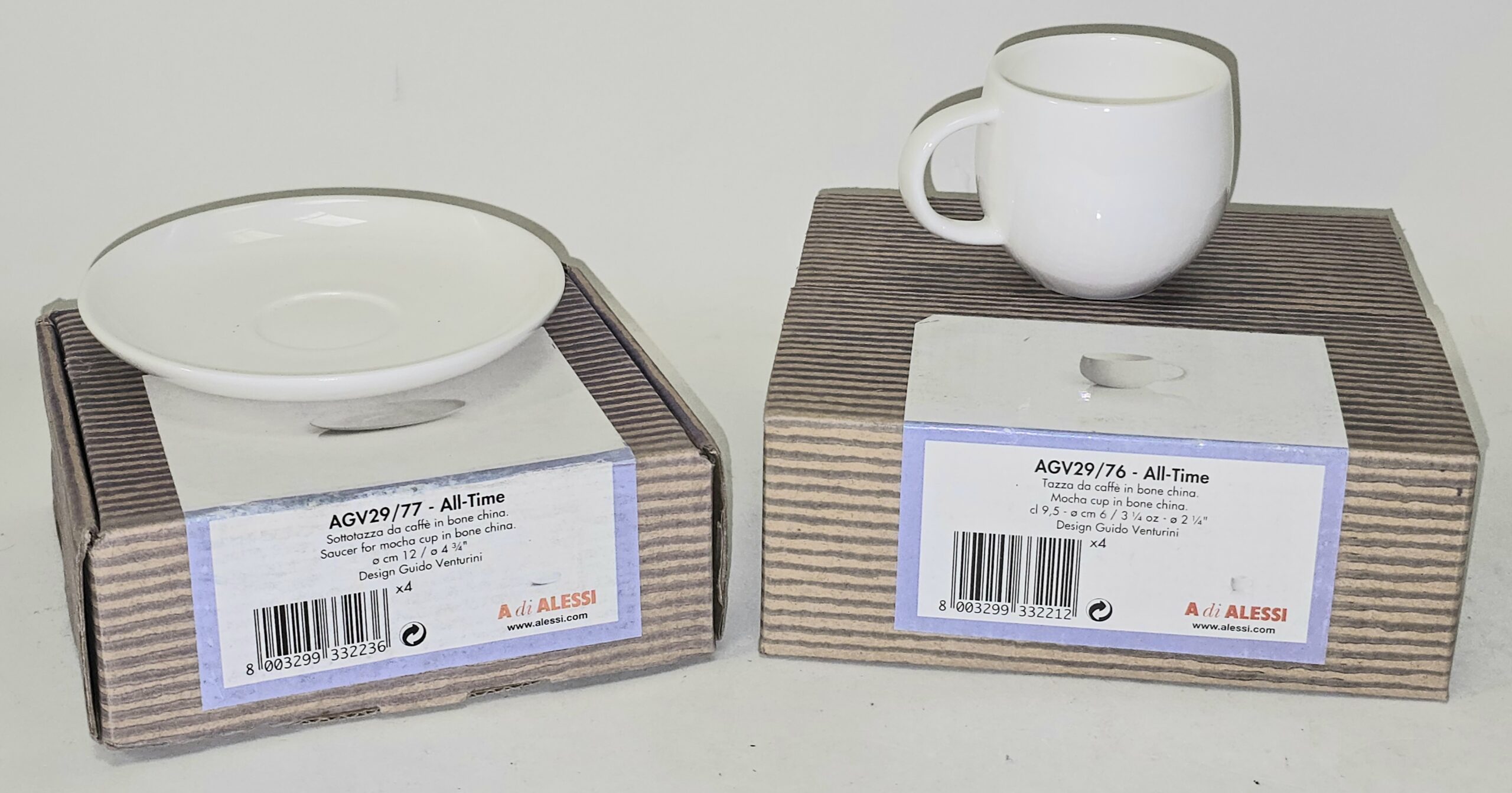 A set of four Alessi All- Time saucers 12cm (AGV29/77) together with a set of four Alessi All-Time mocha cups (AGV29/76)