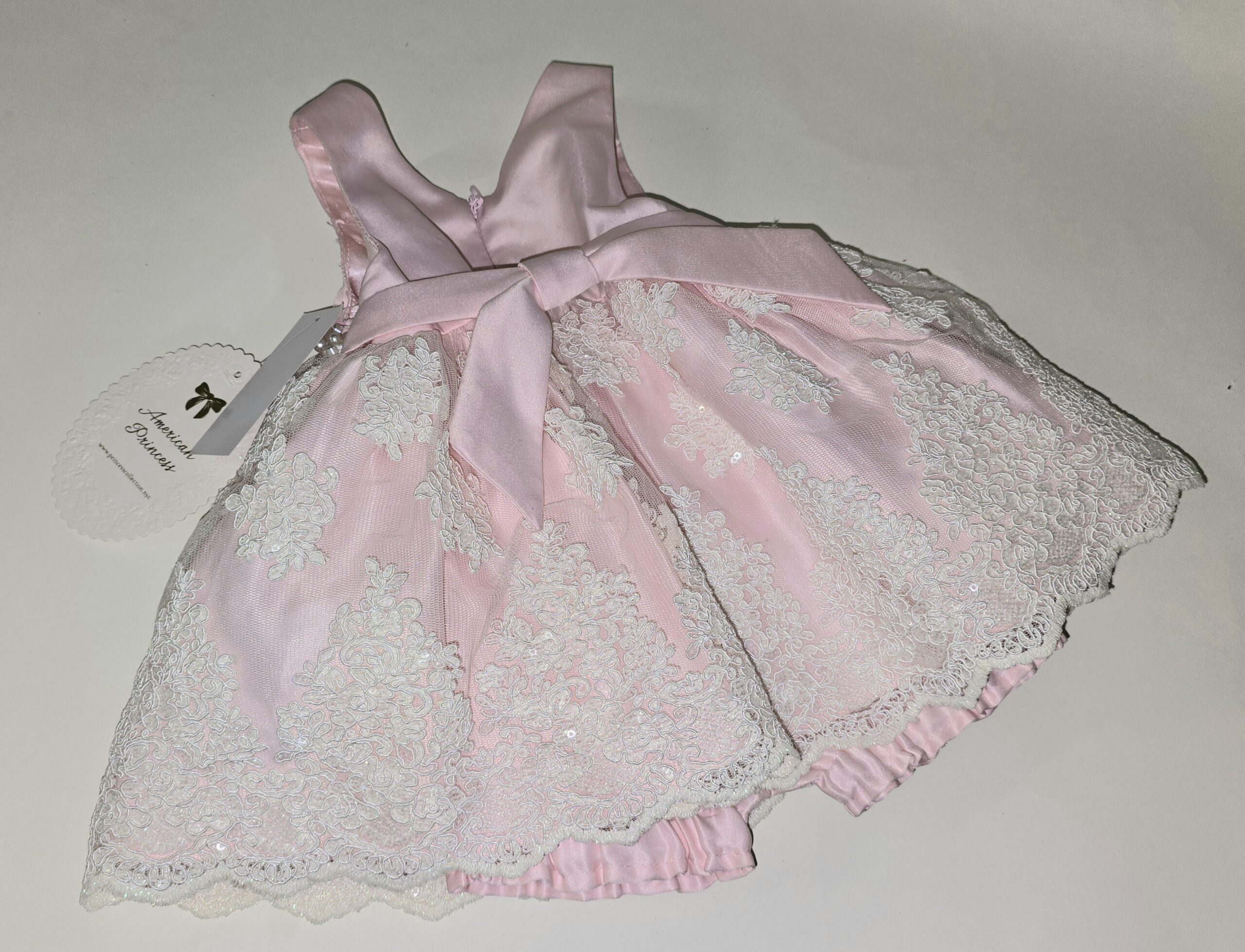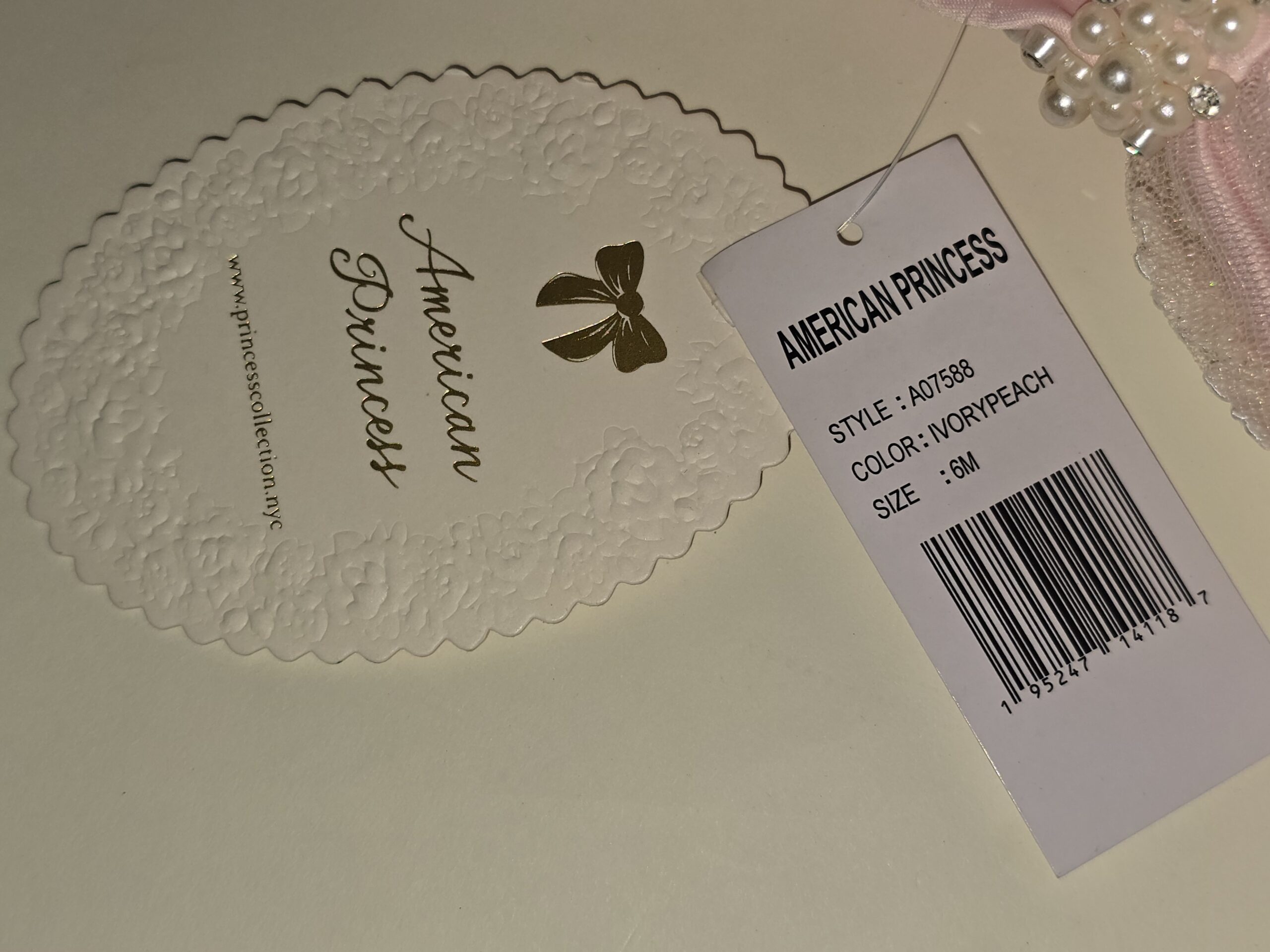Beautiful dress in Ivory and peach Style no. A07588 pearl and rhinestone embellishment to waist and embroidery and sequins design to skirt with matching bloomers.