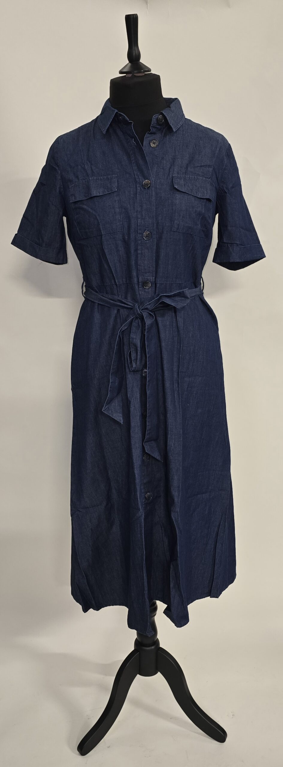 Midi shirt dress, button up and tie waist belt.