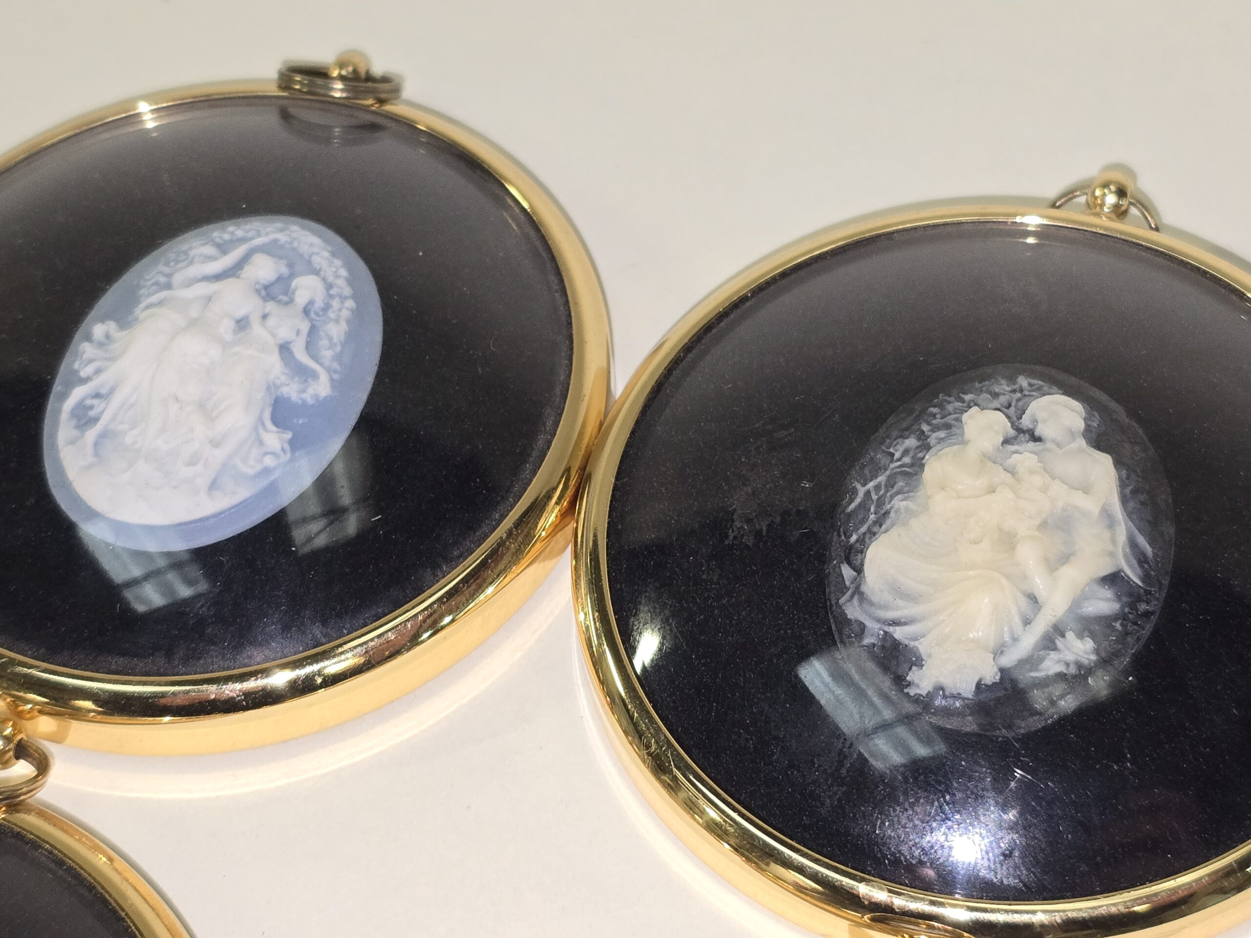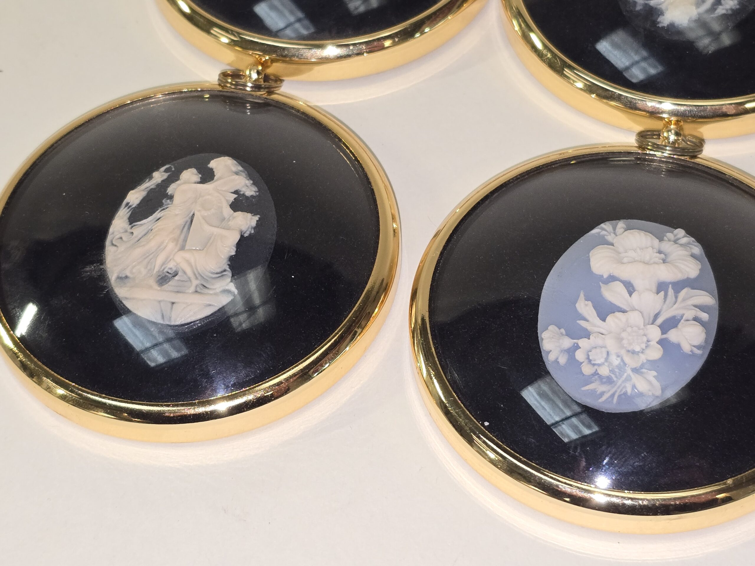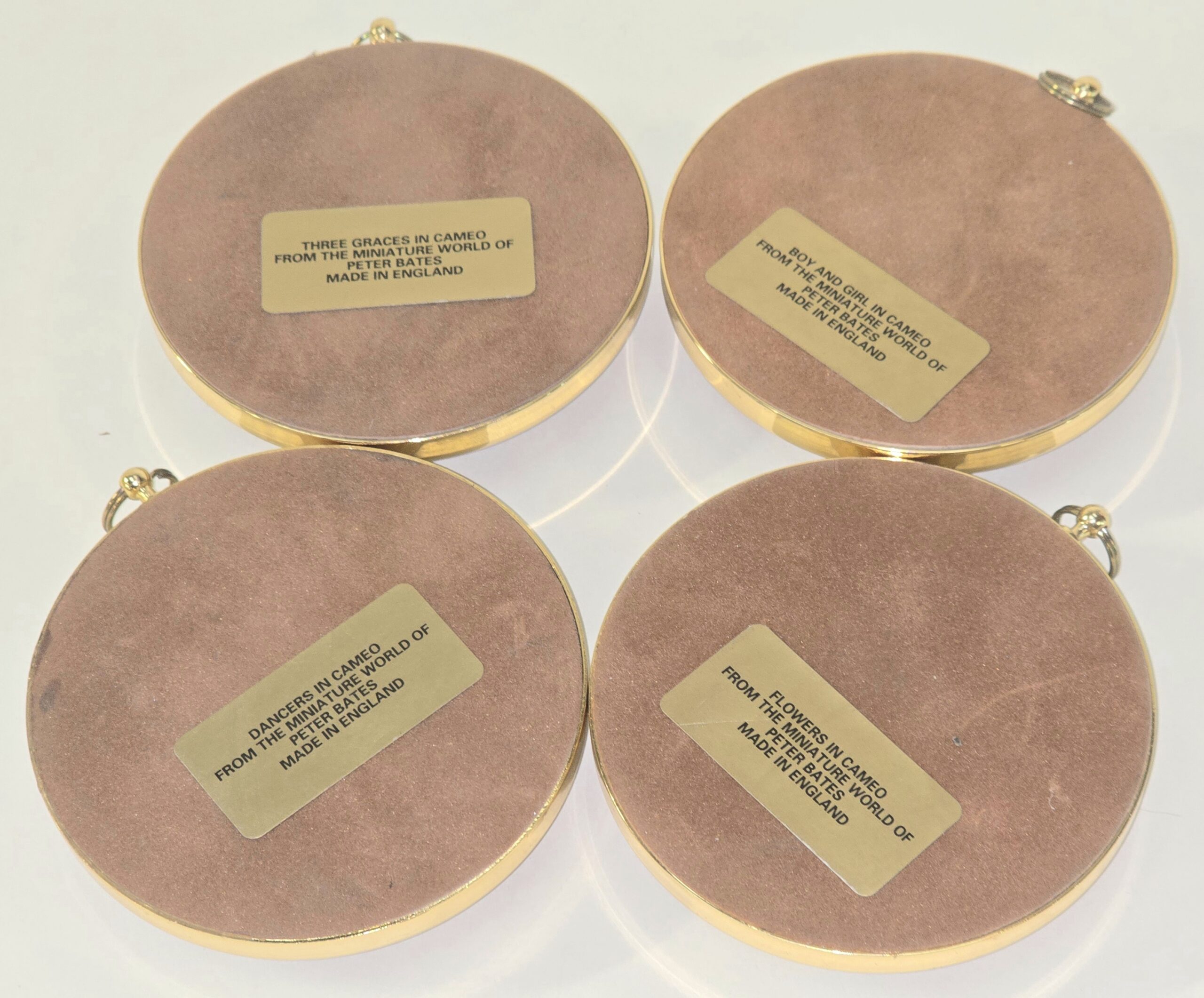 4 x Peter Bates vintage miniature cameo wall plaques to include Dancers in Cameo, Boy and girl in cameo, Three graces in cameo and Flowers in cameo.