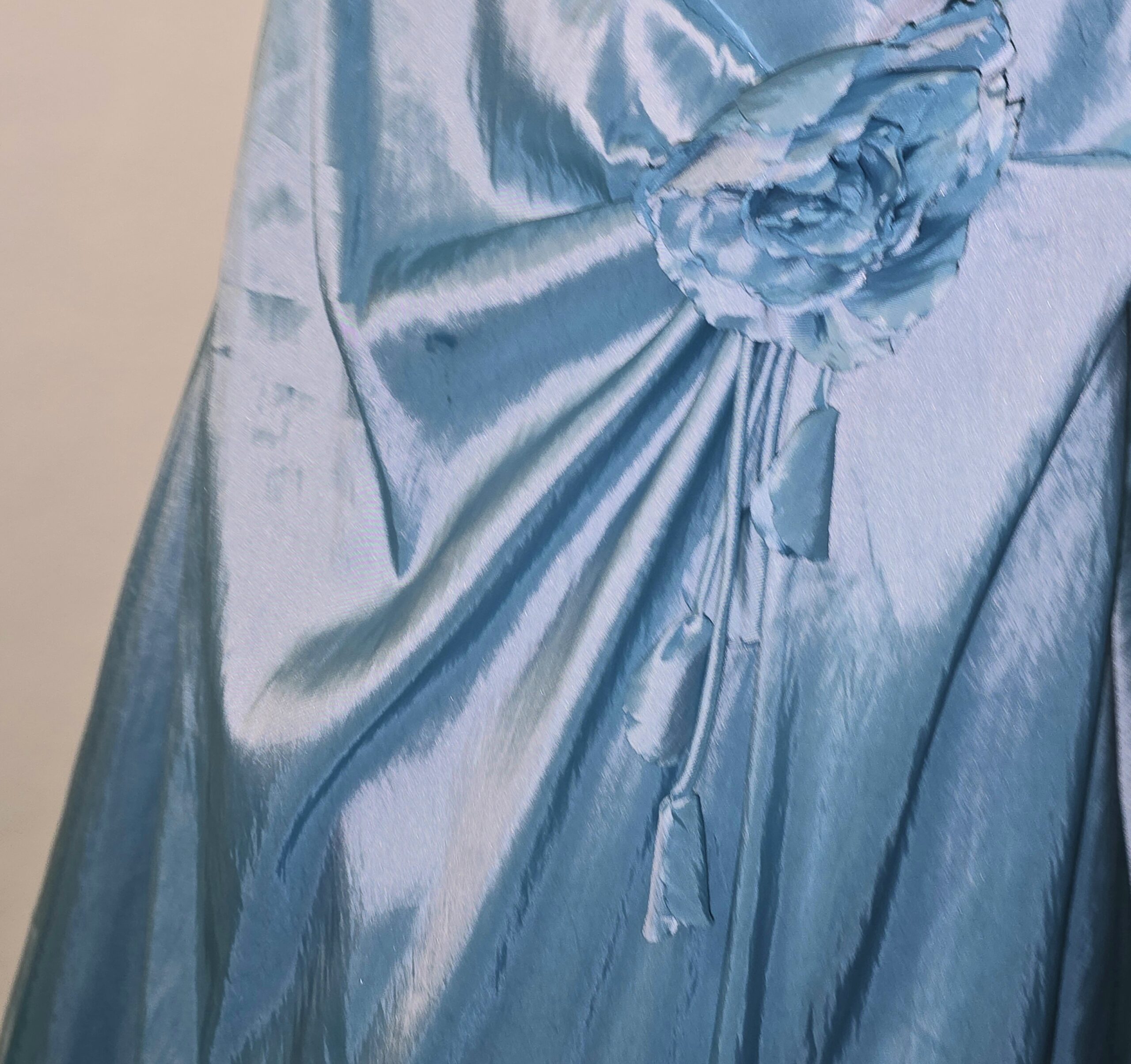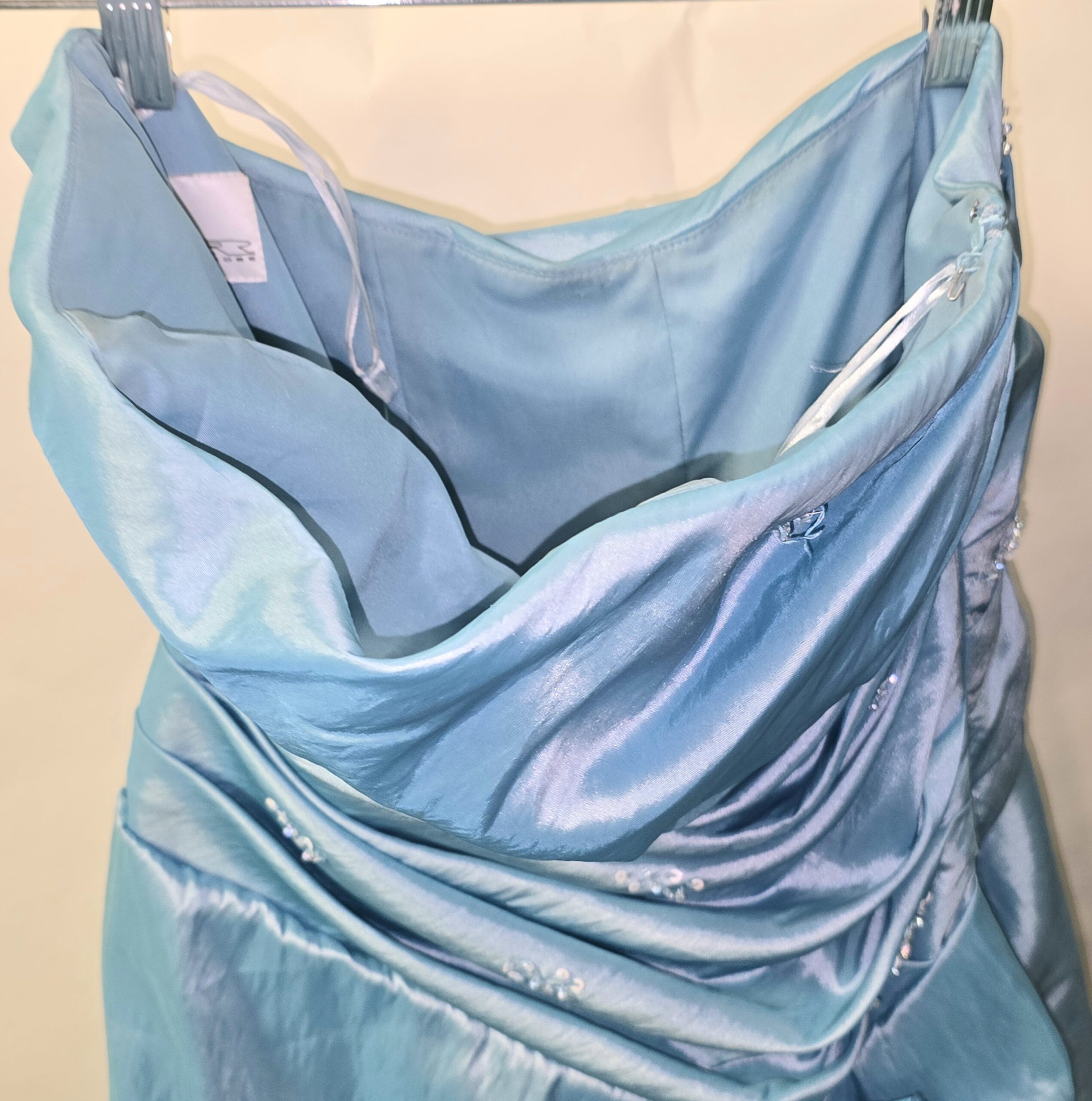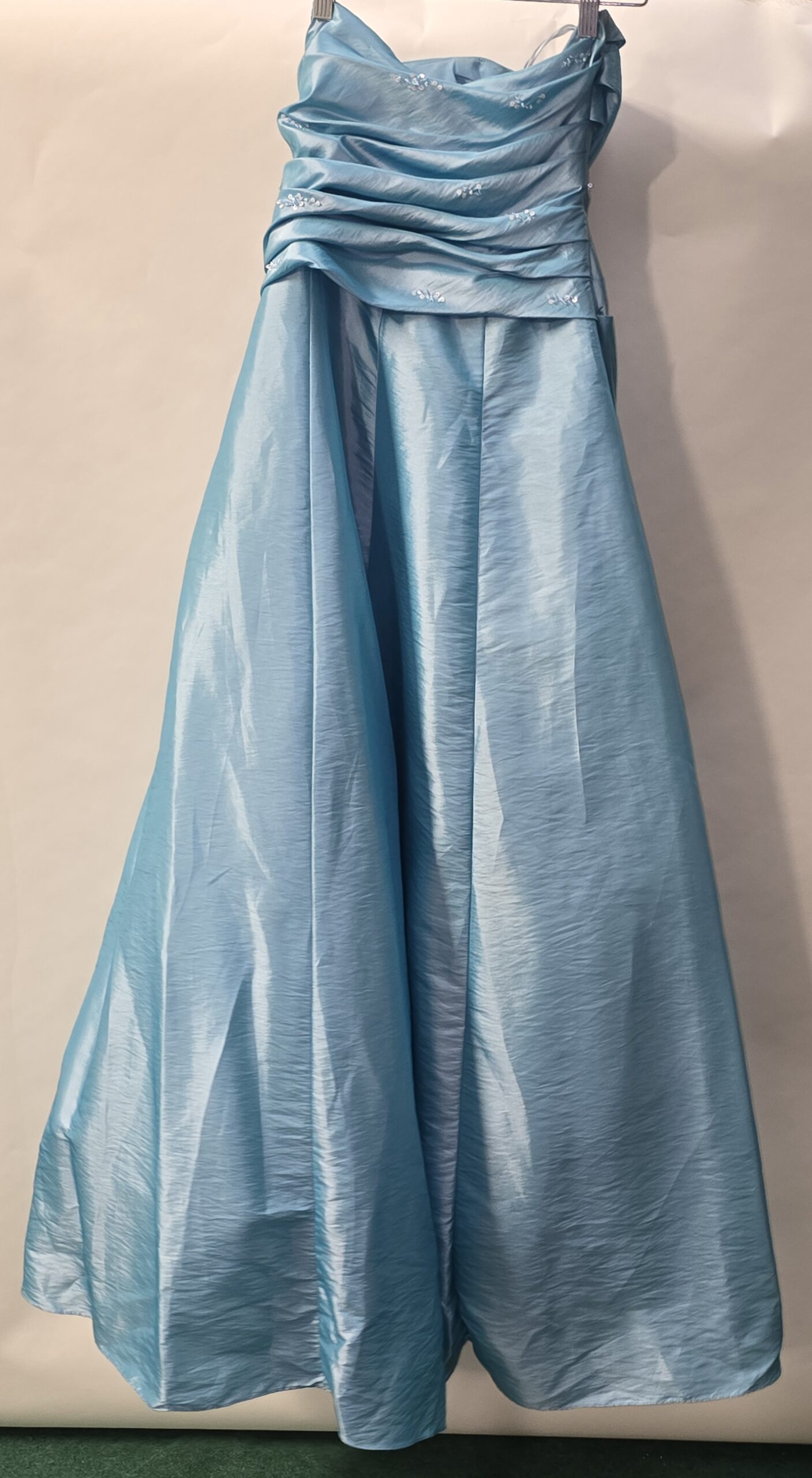 Satin Aqua Blue A line formal dress with ruched bodice and with embellishments of sequins to top and Flower accent to one side of waist, floor length.