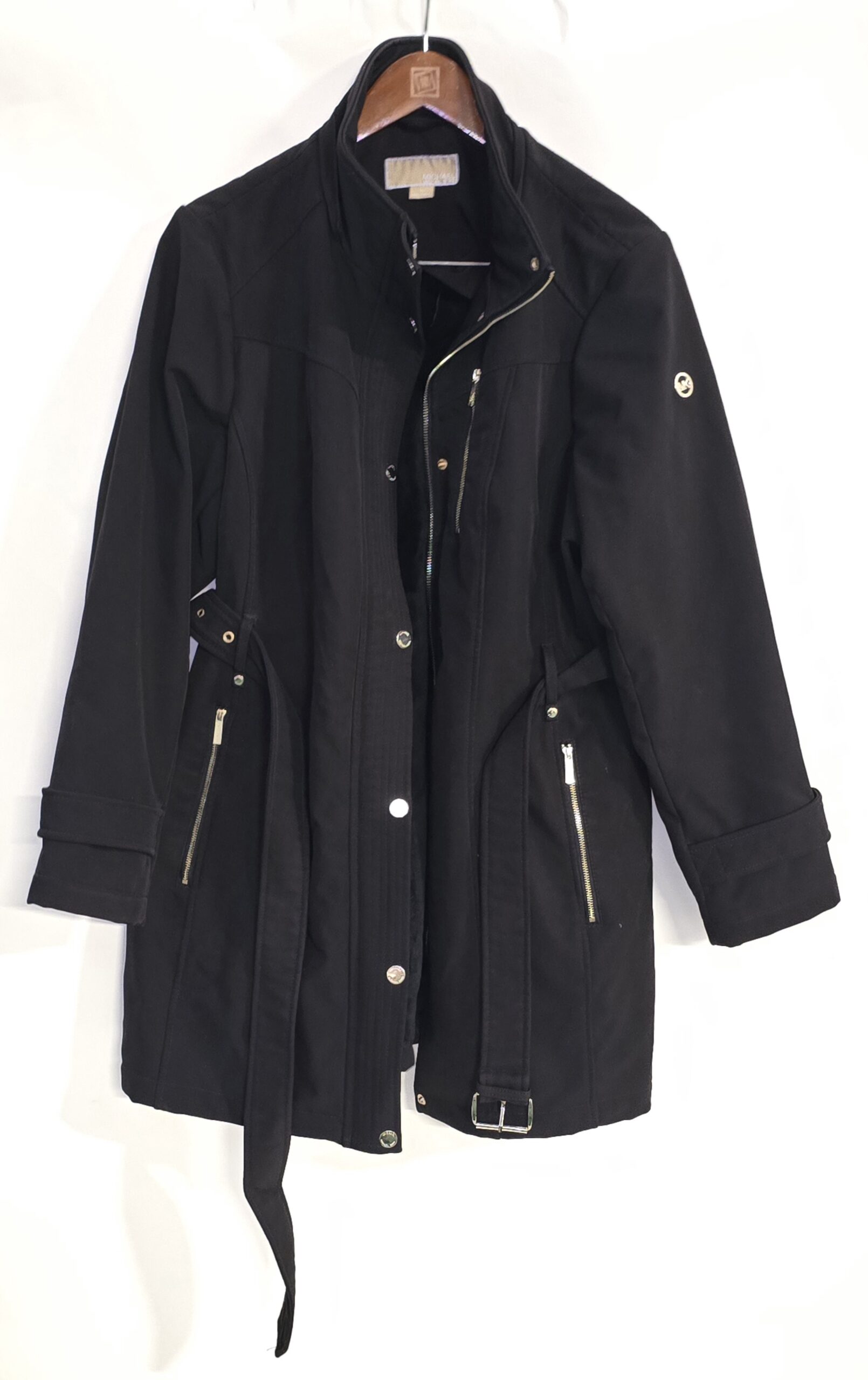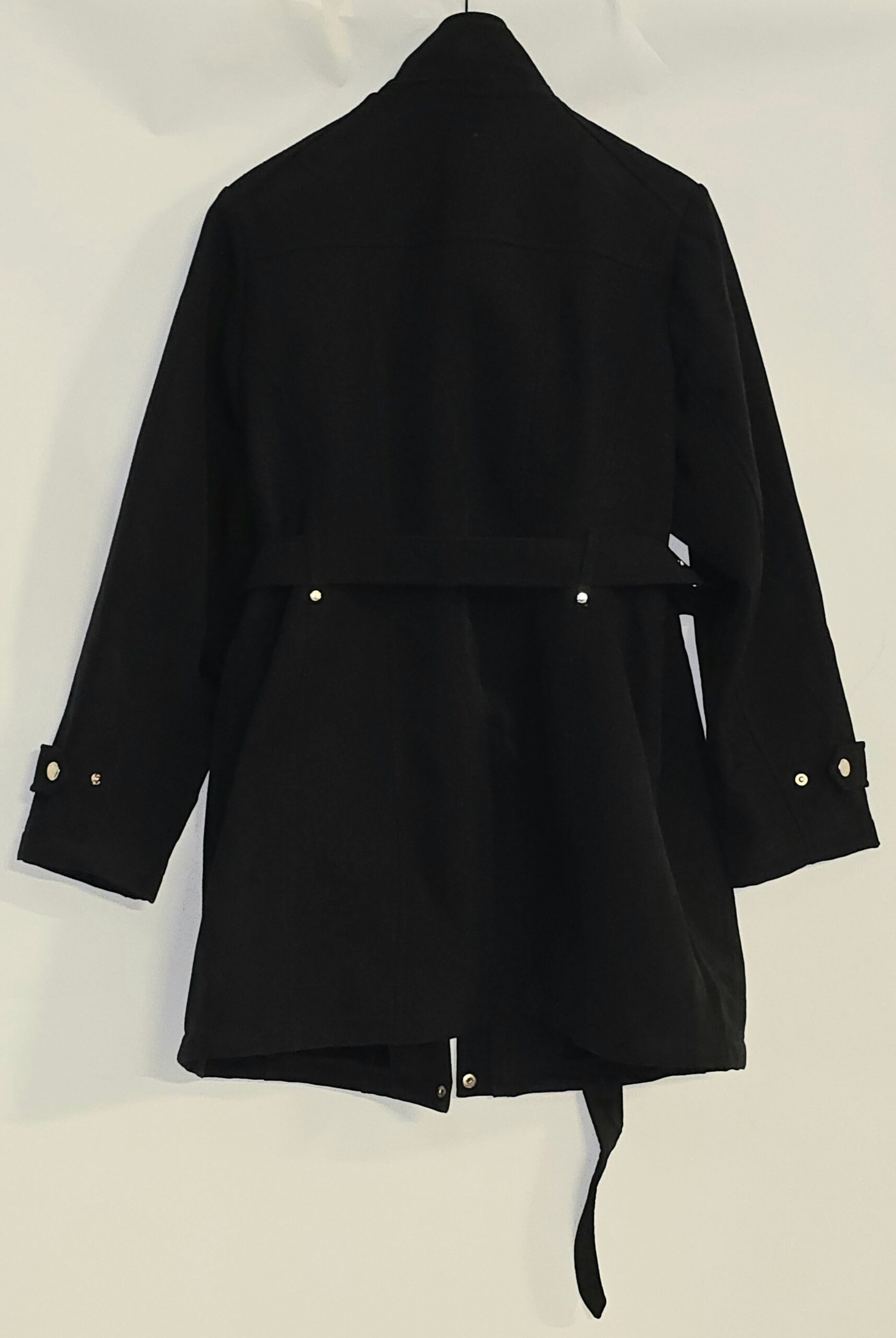 Good quality jacket with belt and gold colour buttons and zips. Stylish designer jacket.